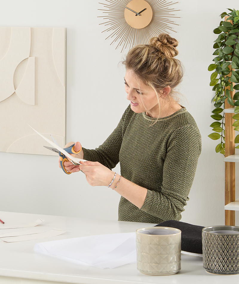 Zuerst überlegt man sich, welche Blattform die Zimmerpflanze bekommen soll – ob groß und tropisch oder klein und zart. Die gewünschte Form🌿 wird auf Karton gezeichnet und als Schablone ausgeschnitten.