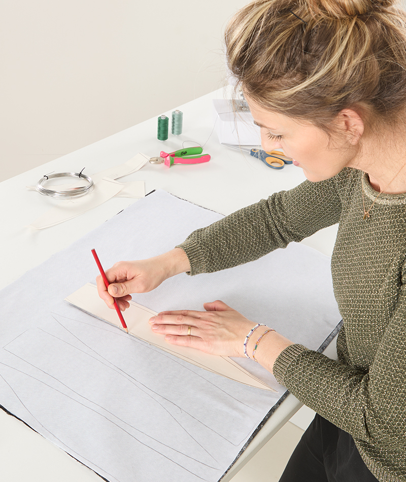 Dann kommt die Schablone zum Einsatz: einfach auf den Stoff legen und die Form mit einem Stift übertragen. Für jedes Blatt braucht man zwei Stoffteile. Ich lege die beiden Teile rechts auf rechts übereinander, sodass die Vlies-Seite nach oben zeigt, und fixiere alles mit ein paar Stecknadeln – so verrutscht beim Zuschneiden nichts.