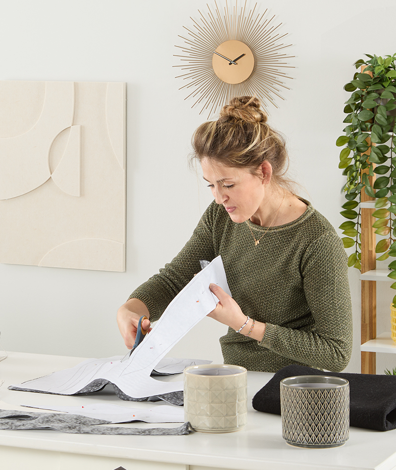 Bevor es an die Nähmaschine geht, werden alle Schnittteile sorgfältig vorbereitet. Mit einer Schablone aus Karton lassen sich die Blätter gleichmäßig zuschneiden – so entsteht am Ende eine harmonische Stoffpflanze. Schritt für Schritt wächst das DIY-Projekt zu einer dekorativen, pflegeleichten Zimmerpflanze heran. ✨