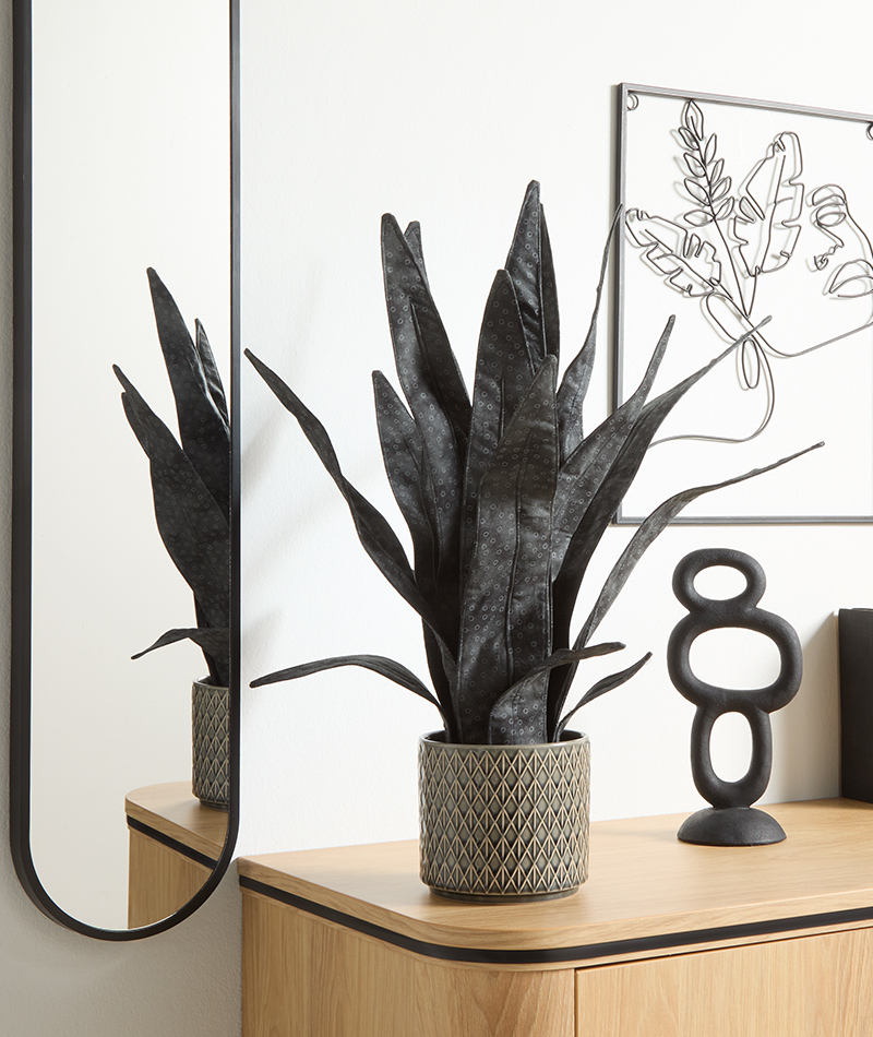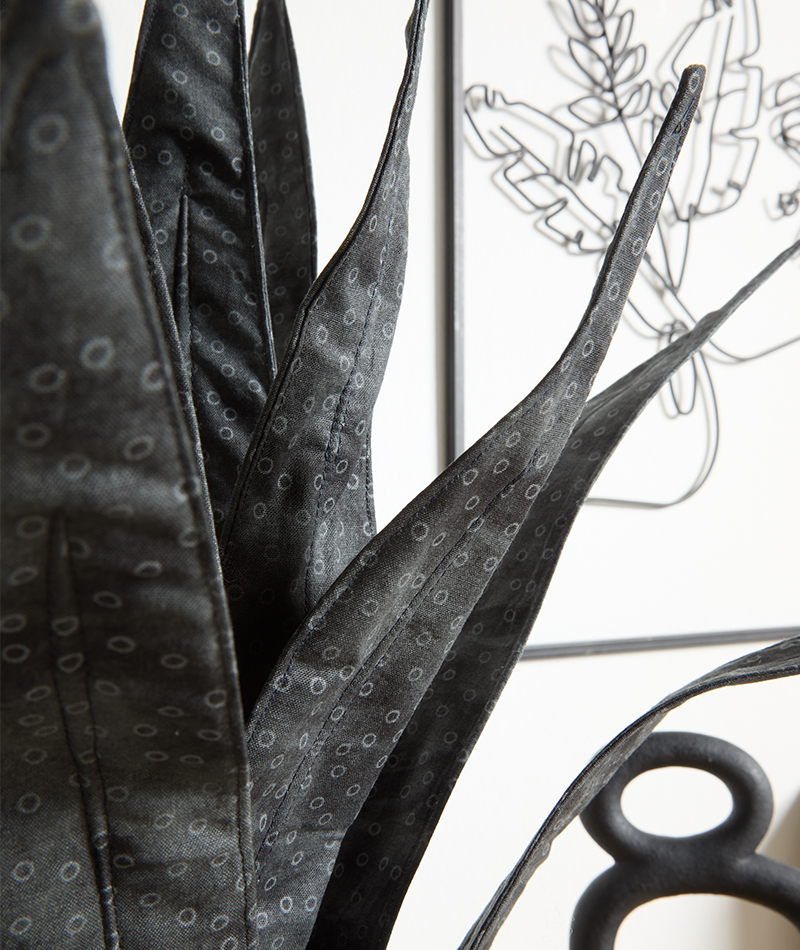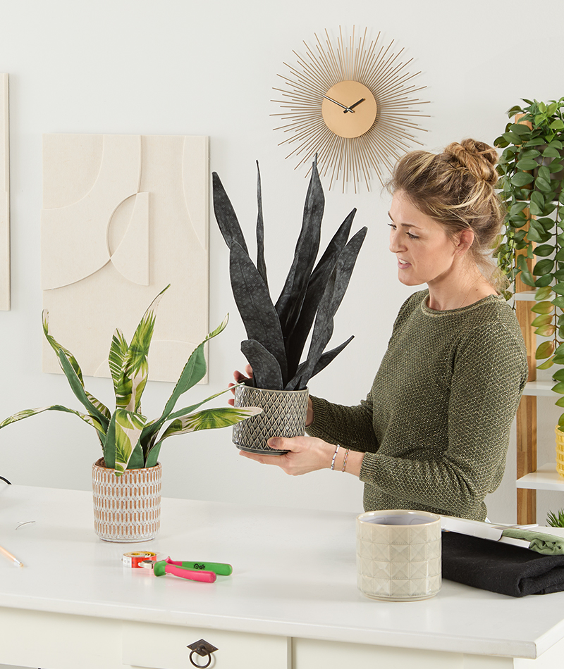 Die gerollte „Blattschnecke“ wird anschließend nur noch in einen Übertopf gesteckt – und fertig ist die Zimmerpflanze aus Stoff.